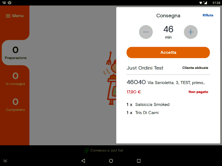 All’arrivo di un nuovo ordine il dispositivo comincia a suonare e apparirà sulla destra una finestra con il dettaglio dell’ordine. Prima di accettare l’ordine avrai la possibilità di posticipare l’orario di consegna cliccando sugli appositi pulsanti (non consigliato).