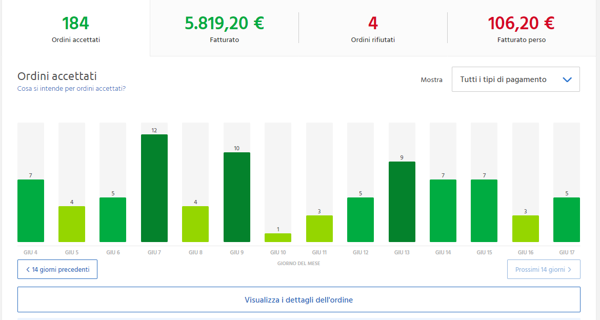 Dal Partner Centre tieni traccia del movimento degli ordini che ricevi su Just Eat giorno per giorno. Dalla pratica dashboard potrai verificare il numero di ordini ricevuti e quanto fatturato hanno generato per la tua attività. Puoi inoltre controllare gli ordini che hai rifiutato e monitorare i guadagni che hai perso a causa di ciò.
