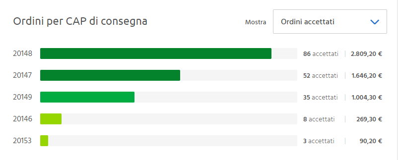 Dal Partner Centre potrai inoltre osservare i luoghi da cui i tuoi clienti ordinano di più. Questo ti aiuterà a concentrare l’attenzione sulle aree che rendono meglio e ottimizzare le tue consegne.